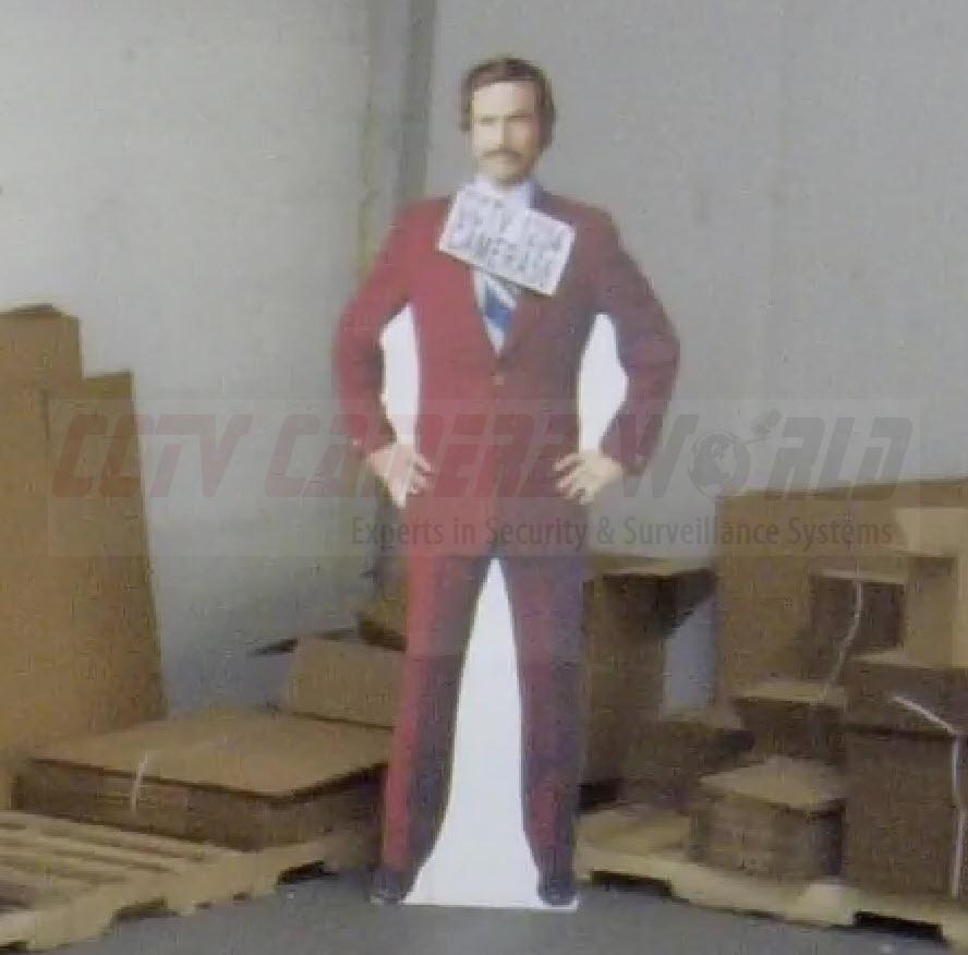 Here is an example of an indoor picture quality during lit conditions. The camera is mounted roughly 50ft away from the cutout, at approximately 15ft height. The visual is clear and crisp for this distance. If you click on the picture thumbnail below, it will open up in a popup with the full resolution 4K image giving you a good idea of the power this camera has to offer. You can make out the letters on the board hanging around the neck of the cutout. There is no optical zoom on this camera, but the digital zoom is impressive for this fixed lens camera.