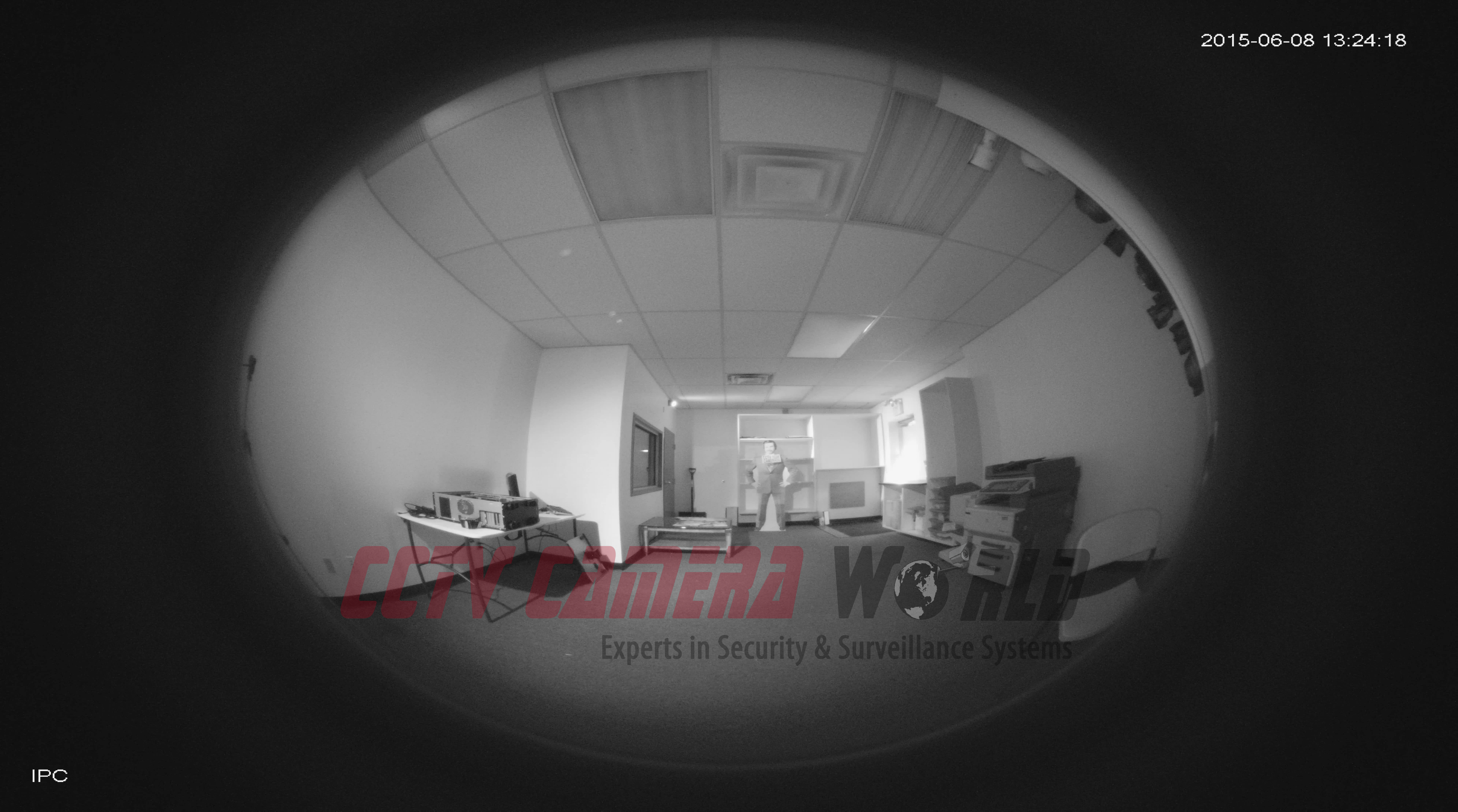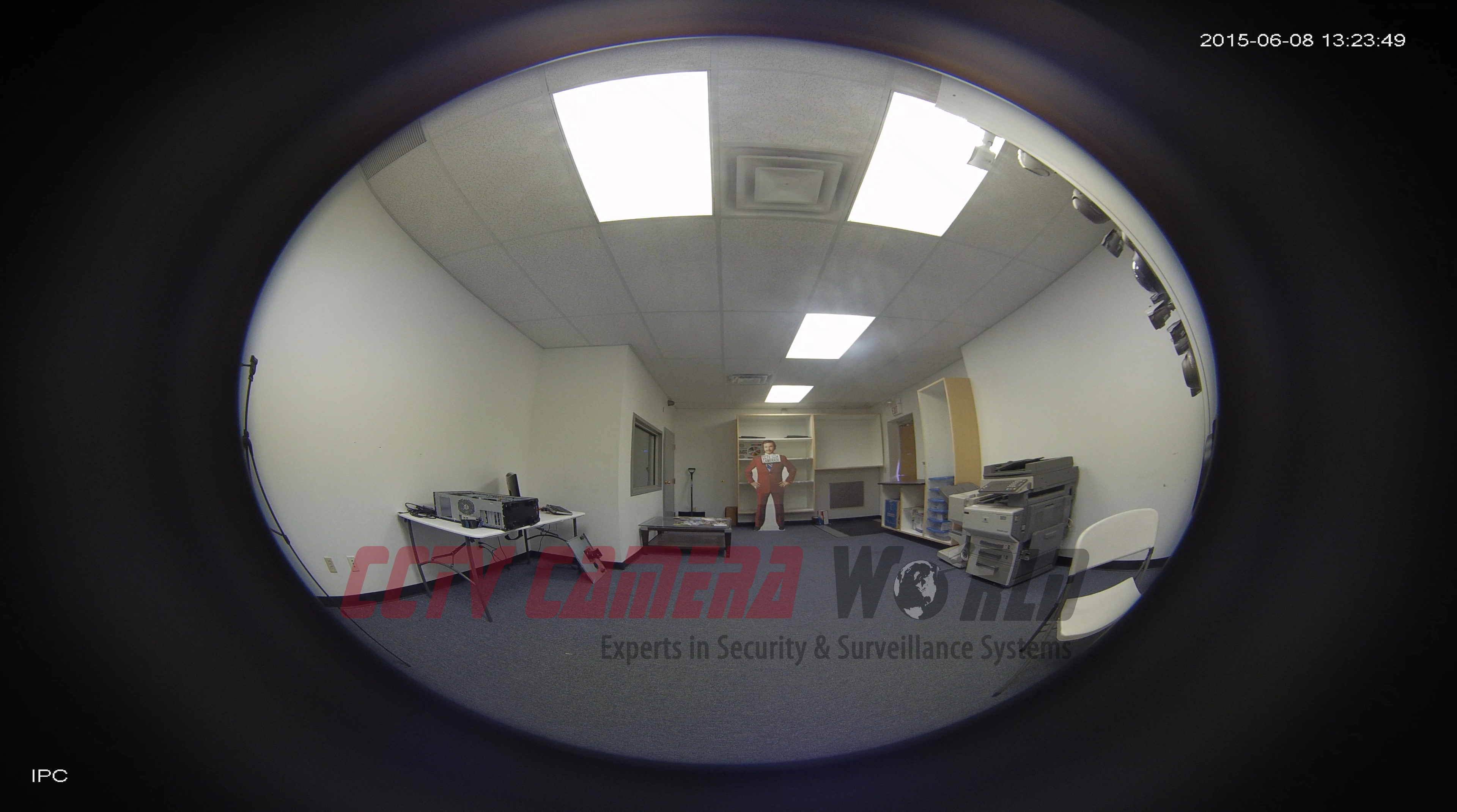 Below are some examples of the 4K fisheye camera in action. You will see in these snapshots that this camera has close to a 360 degree angle of view. The image produced is with black corners and an oval in the center containing video captured by the image sensor. If you’ve never seen video produced by a 360 degree security camera, this view may seem odd but rest assured it is perfectly normal. You can see a wide area in the peripheral view of the lens so this camera can easily cover a full room depending on how high it is mounted. Here’s an example of the camera in our lobby.
