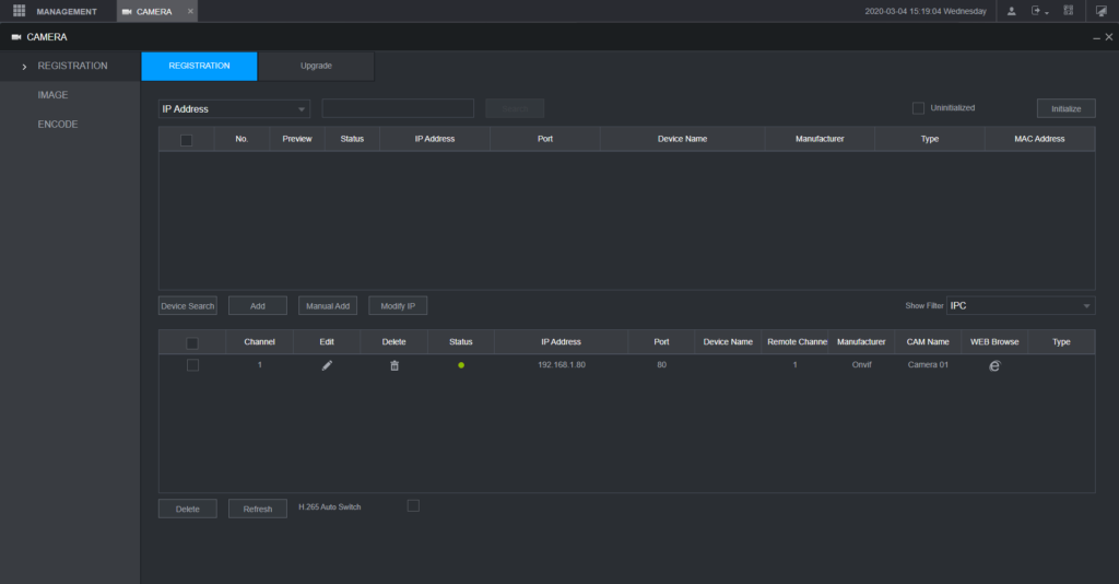 When you first login to your NVR you will see a lot of options. You will want to navigate to the Camera Registration screen. On our NVR this is done by clicking Management at the top left and choosing the top option Camera.