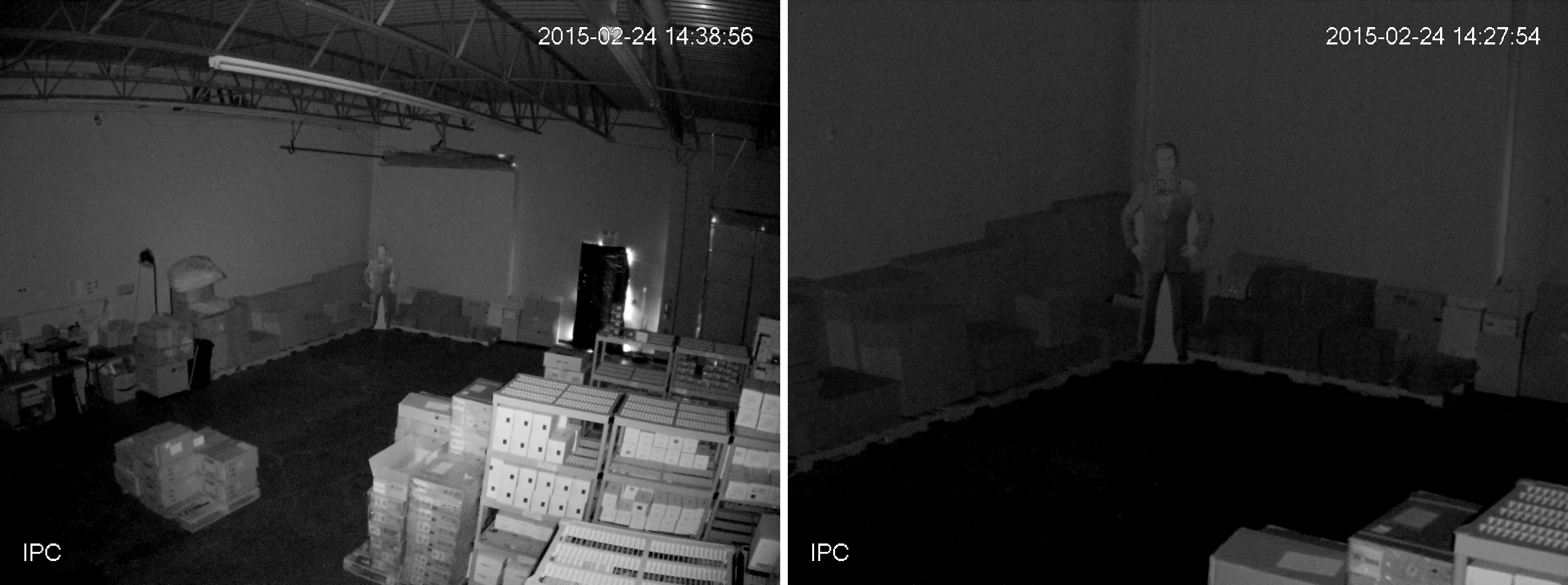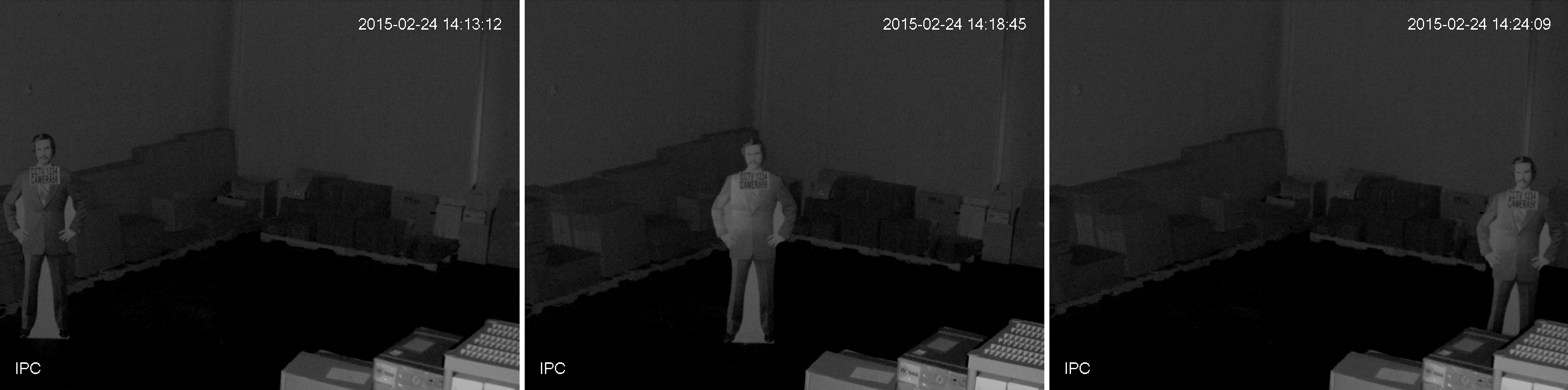 The above image shows the cutout positioned at 30 feet from the cameras mounting surface. The Infrared light in clearly being distributed evenly. If we were getting Infrared glare, when positioned to the extreme right, the cutout should barely be visible. In this case, we actually see that moving the cutout around 20 feet closer to the camera actually makes a substantial difference. Not only can you actually make the figure out now, but you can also begin to identify smaller details.