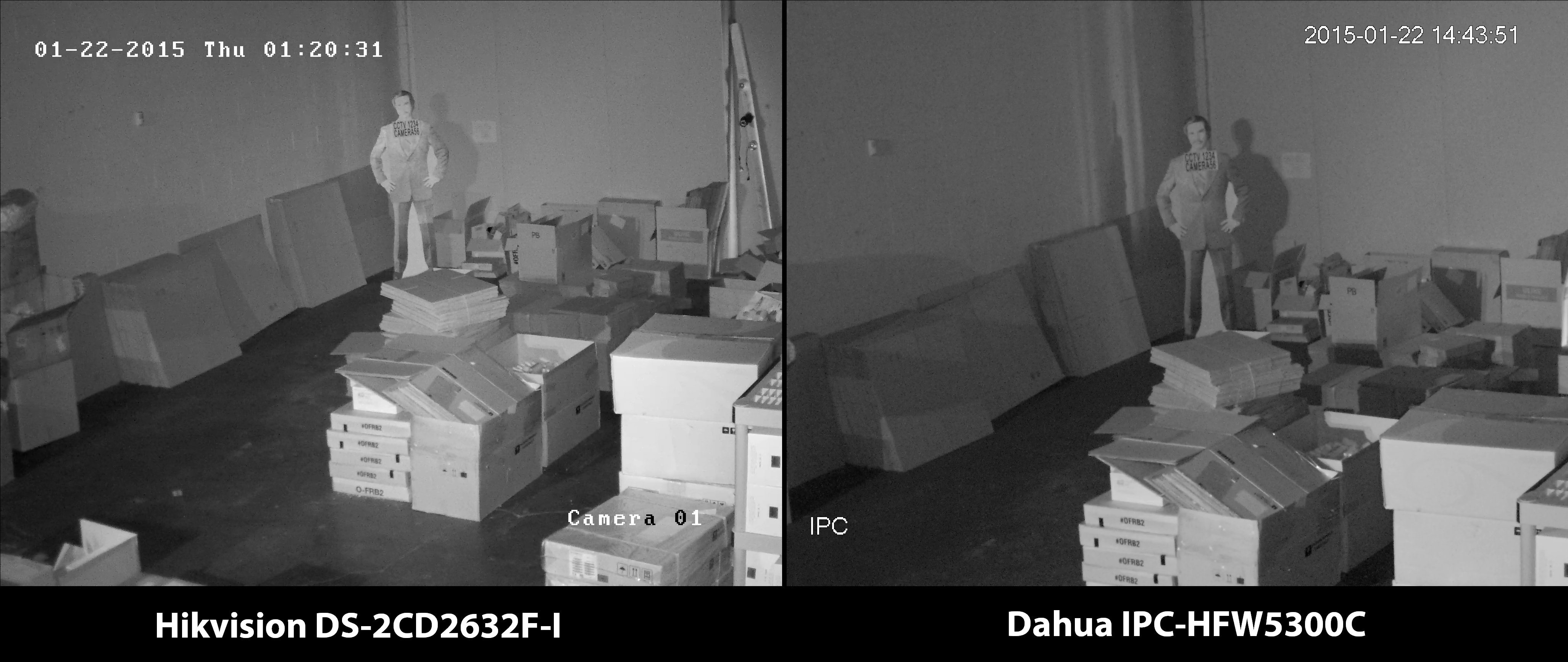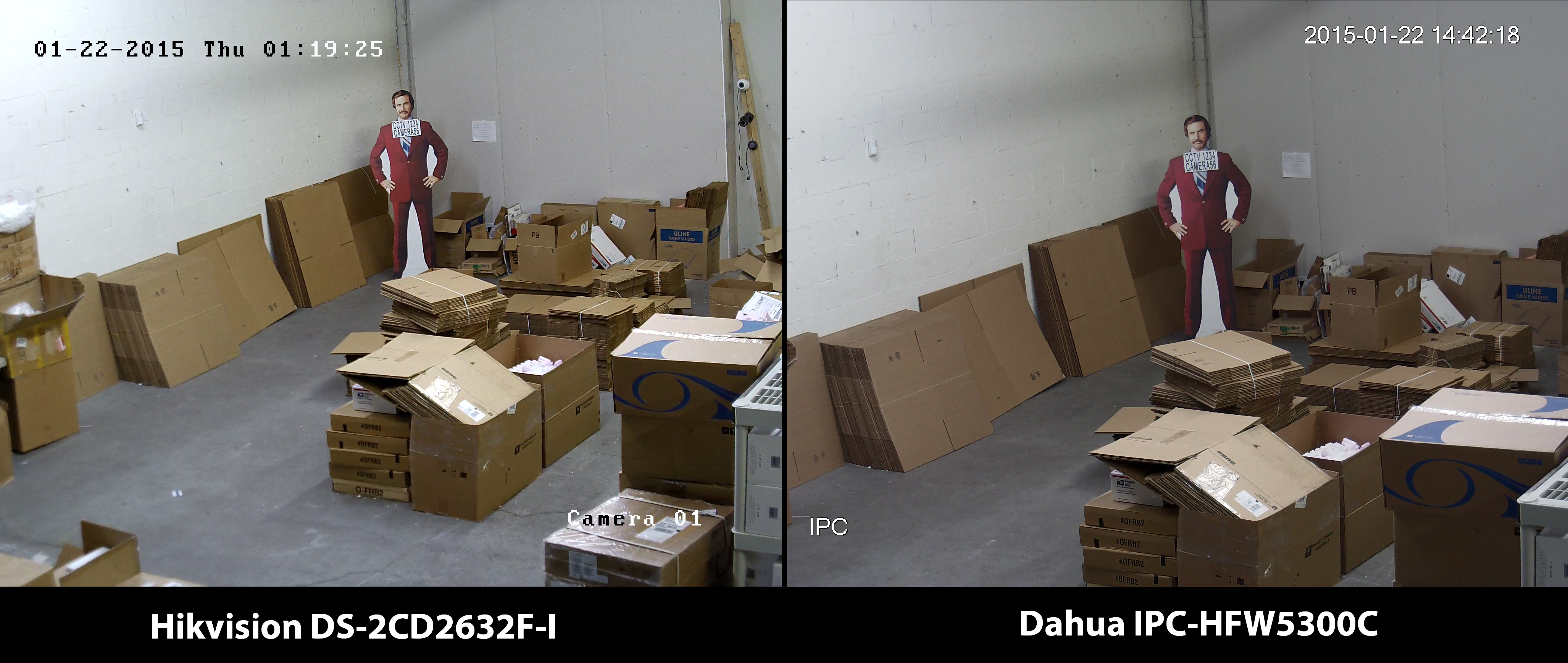 Before we say anything else, please forgive our mess. If you read our previous review, you may recall that our cardboard cutout in the far corner is approximately 50 feet from the cameras mounting surface; the cameras are mounted at 15 feet. We liked what we saw here from both cameras but the Dahua 5300C really outperformed our expectations. Even with it zoomed out at its 2.8mm mark, we can still make out Ron's face and the sign around his neck at 50 feet. It's a bit fuzzy around the edges, but be sure to click on the image to view it in full size. You'll notice that you have no hope of making anything out in detail with the Hikvision 2632, but if you look hard enough, you have just about enough for a positive ID with the Dahua 5300C.