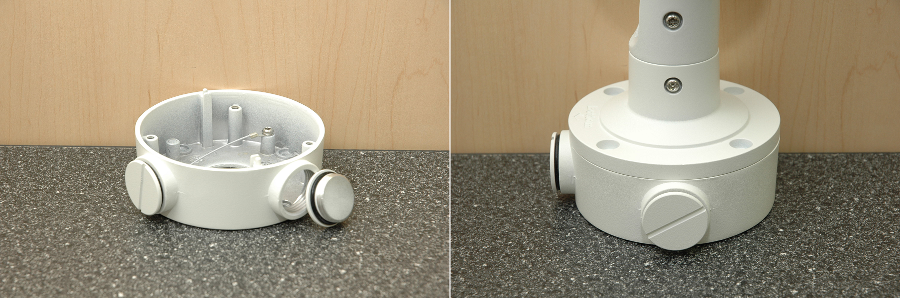 As it was with our smaller fixed lens bullet IP cameras, the contents of each cameras boxes are very similar. Both include a user manual, mini disc, drilling template, and mounting hardware. Again, the mini discs contain a general user guide, software, and configuration tools. After that, the Hikvision 2632 separates itself a bit. Unlike the Dahua 5300C, the 2632 comes with a BNC test cable that you can attach to its Infrared (IR) board and then use with a standard CCTV tester. Understandably not everyone has a CCTV tester so this may not be a big to you. If you do, you might find that this can make your installation a bit easier. While the 5300C doesn't have this add-on, you can still set the camera up in a similar fashion through the use of mobile applications and your Smartphones and/or tablets. The 2632 also includes a junction box suited for this camera. This junction box will allow you to store the cameras pigtail inside of it instead of having to be pulled through the mounting surface or run through the air. This can potentially mean drilling a much smaller hole as long as you don’t mind that your camera sticks out an extra inch and half or so. Junction boxes such as this are available for almost every camera you can put your hands on but they usually run you another $10-$20, so it’s a nice little add-on from Hikvision. You should note that this is not the same as a junction box you get from the hardware store as this one is absolutely not weatherproof. This means that you'll still need to find a way to protect those connectors or seal the box; otherwise those contacts will corrode and you'll either need to re-tip the cable or even potentially replace the camera.