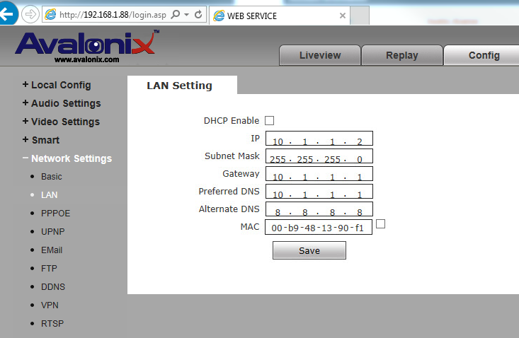 The default IP address of the Avalonix Pro Series camera is 192.168.1.88. Since you are connecting it to a PoE port on the back of one of our NVR with PoE Switch the IP address will have to be changed to match the internal network of the NVR's switch. In the camera settings navigate to: