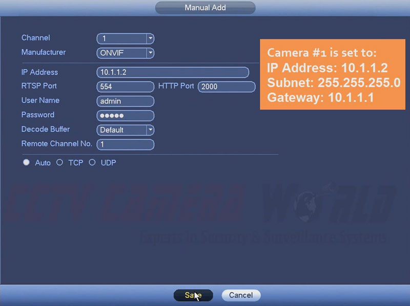 Since this will be our first camera on the NVR, we will set it to the following network parameters: