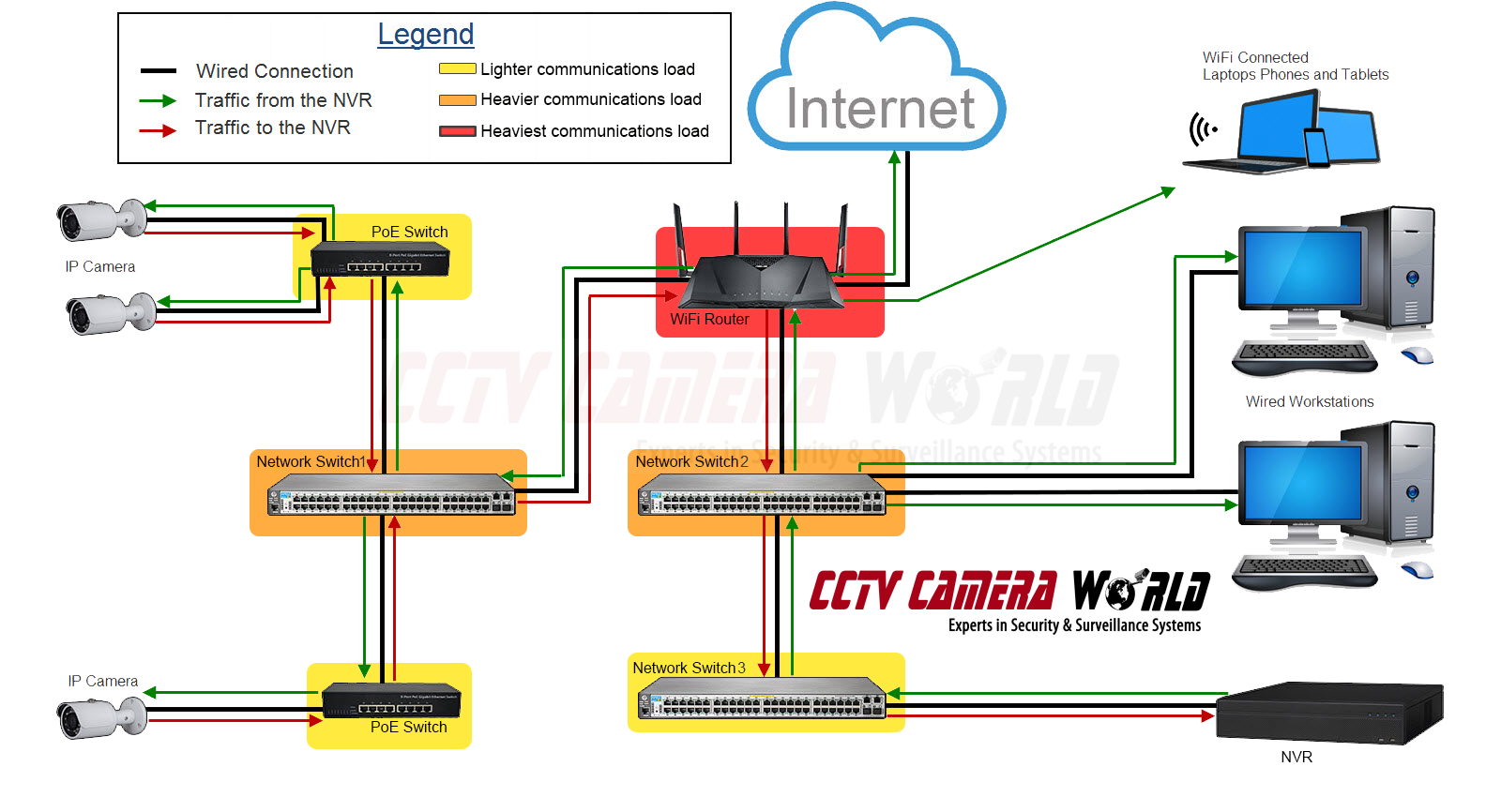 - Data travels through the network toward the NVR, computer, or phone getting redirected to the next device down the line until it reaches its destination