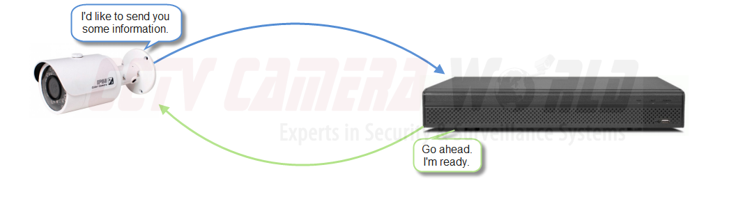 The cameras are constantly compressing video and sending data packets back to the NVR. Once received the NVR will reassemble the packets and error check. After checking for errors the NVR will tell the camera to stop, continue sending data, or to resend the last transmission. This is yet another transmission that needs to be sent down the line back to the cameras.