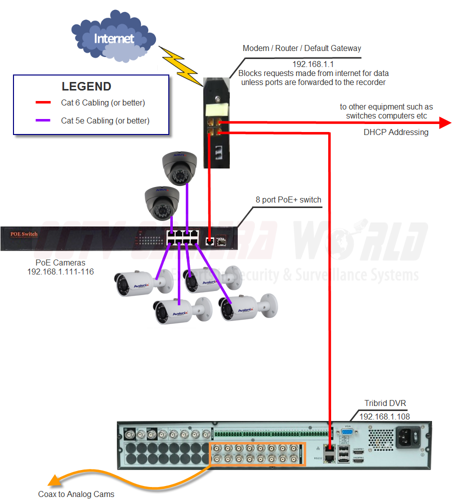 Below in figure 2-1 we see a Tribrid DVR Network Diagram. Tribrid DVRs do not have integrated PoE ports as they need the space for BNC ports to be backward compatible with Analog and HDCVI. The IP cameras will need to be connected to the network with their own unique address that follows the networks scheme. Wiring the PoE switch improperly, or attaching computers to the same switch you are using to send large amounts of data to a recording device is asking for trouble. Make sure that the uplink port goes back to the network using a cable suited for the amount of bandwidth you will require. Let's take a look at a few different network diagrams.