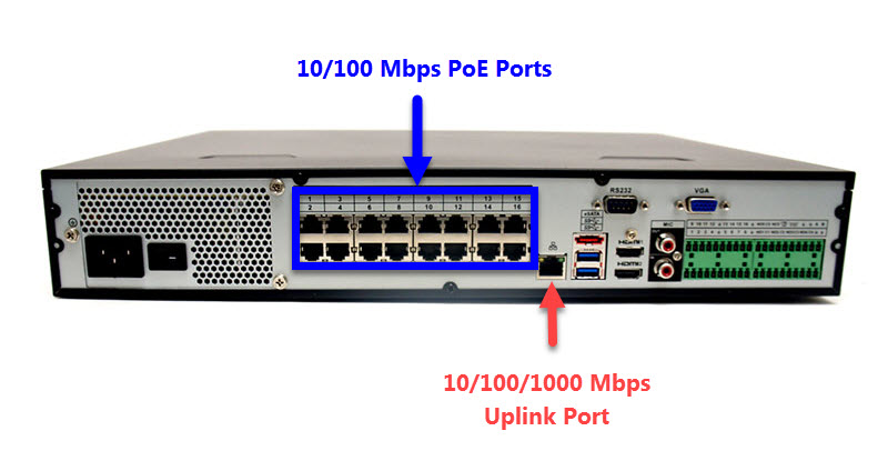 NVR 10/100/1000 Up/Downlink Port - Max data transfer rate 1000Mbps, separate from PoE ports, some models have two uplink ports. These ports are used to connect the NVR how the unit is reached over the network
