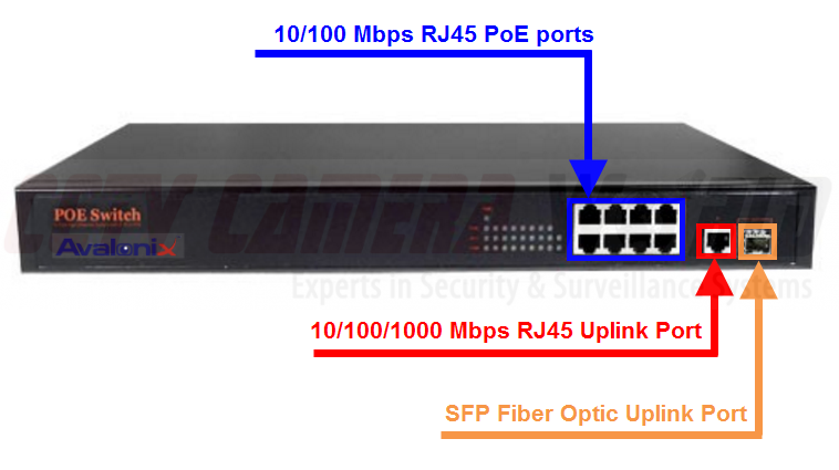 PoE Switch 10/100 PoE Port - Max data transfer rate 100Mbps, sends power to camerasPoE Switch 10/100/1000 Uplink Port - Max data transfer rate 1000Mbps, connects the switch to the network, used for the switches backbone